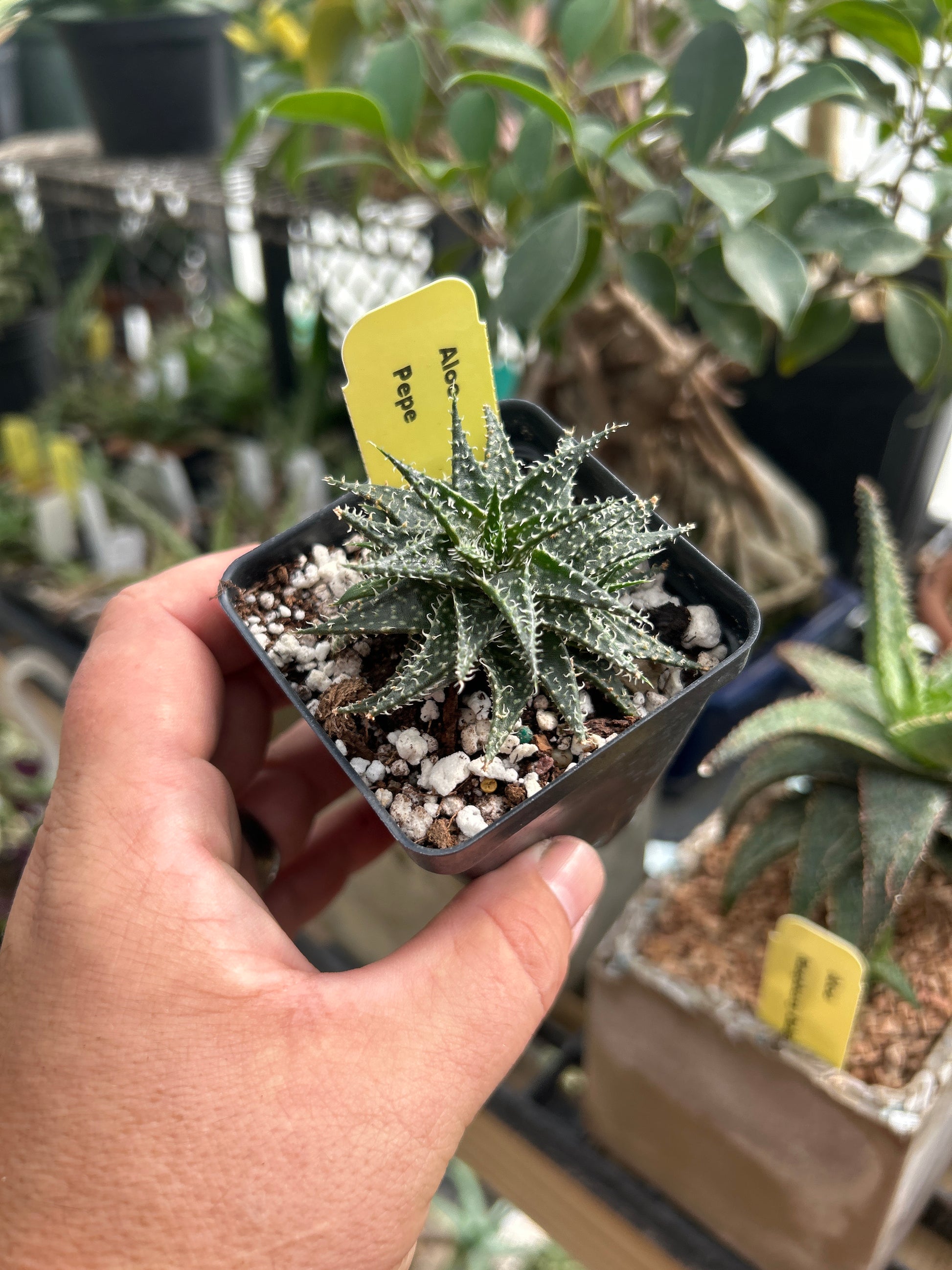 Compact castilloniae hybrid with deep green, lightly speckled foliage. Tiny soft white ‘teeth’ along the succulent leaf margins. ‘Pepe’ stays small (appr 2” across) and produces basal pups very readily, eventually creating an attractive mounding habit. Pet safe. Growers choice.