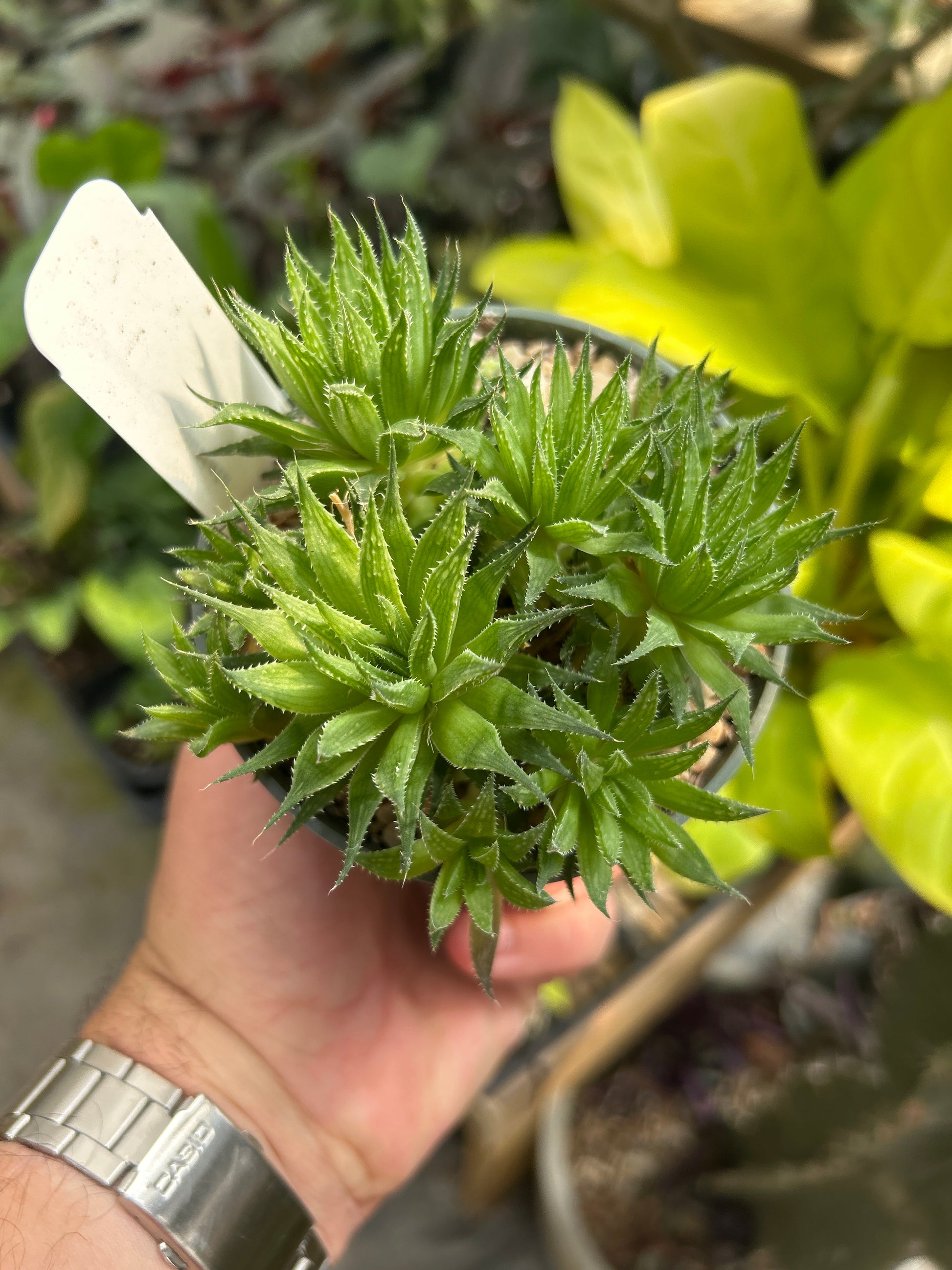 4” pot of this small, clump-forming Haworthia. Lightly toothed, bright green leaves with very pretty, pale striations. Very easy care. Pet safe. Growers choice.
